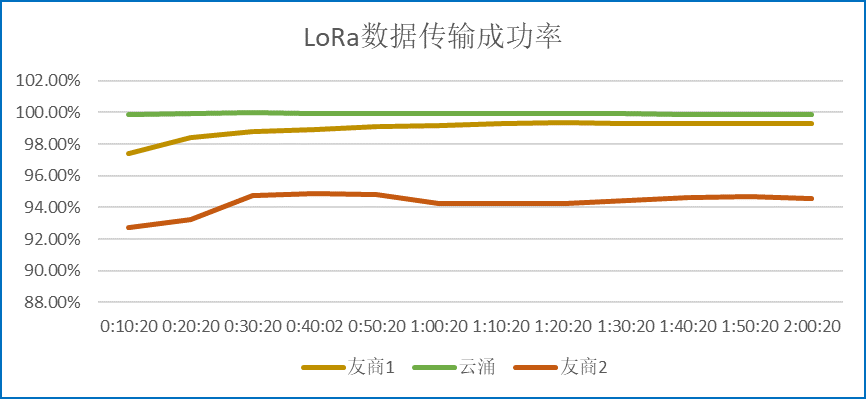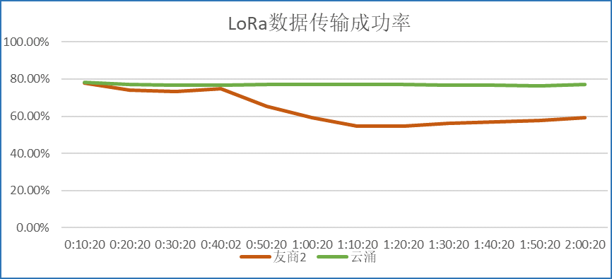 ? ? ? 在測試環(huán)境穩(wěn)定且一致的條件下,通過同樣的連接方式,對比云涌LORA數(shù)傳電臺和另外兩家友商設(shè)備的測試結(jié)果,可以得出:云涌科技的LoRa DTU擁有更好的抗干擾能力,而且在同頻干擾的情況下,傳輸?shù)某晒β矢?,傳輸?shù)姆€(wěn)定性更好。