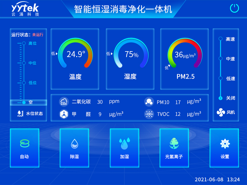 ? ? ? 此外,云涌智能恒濕消毒凈化一體機還具備智能化、人性化、直觀化的運行方式及操作體驗,運用微電腦智能控制技術(shù),全中文液晶觸控屏,功能模塊化設計等,搭配遠程監(jiān)控系統(tǒng),實時智慧感知分析預制故障;同時,設備自身配有大容量的內(nèi)置雙層水箱,實現(xiàn)雙重防漏保護,結(jié)合配備的缺水、水滿、溢水漏水報警系統(tǒng),用戶可通過人工加水和自動加水兩種可選方式,使整個設備在使用過程中更加安全便捷。